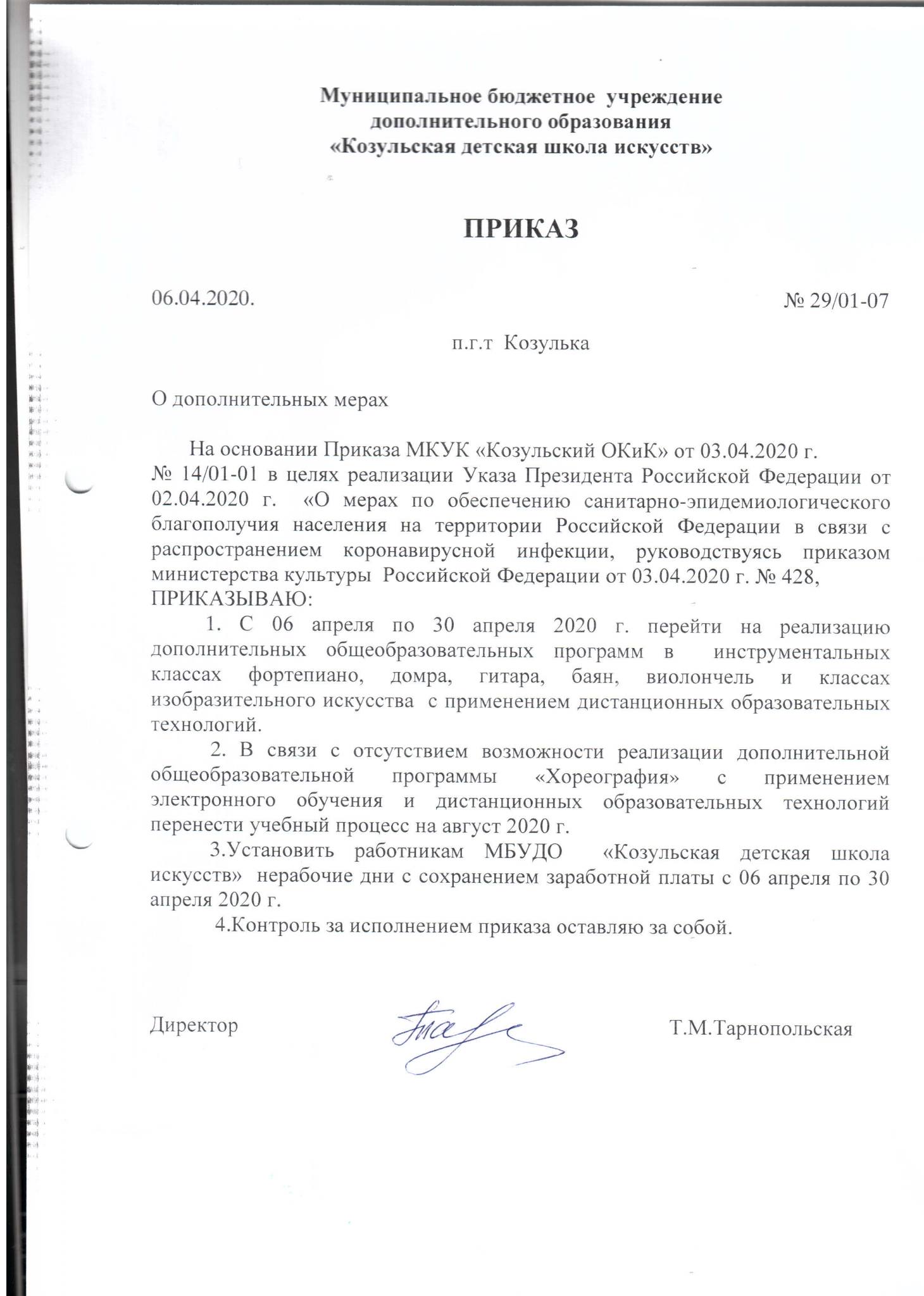 Уведомляем Вас, что с 06.04.2020 в Козульской детской школе искусств вводится дистанционное обучение на основании следующих нормативных актов: